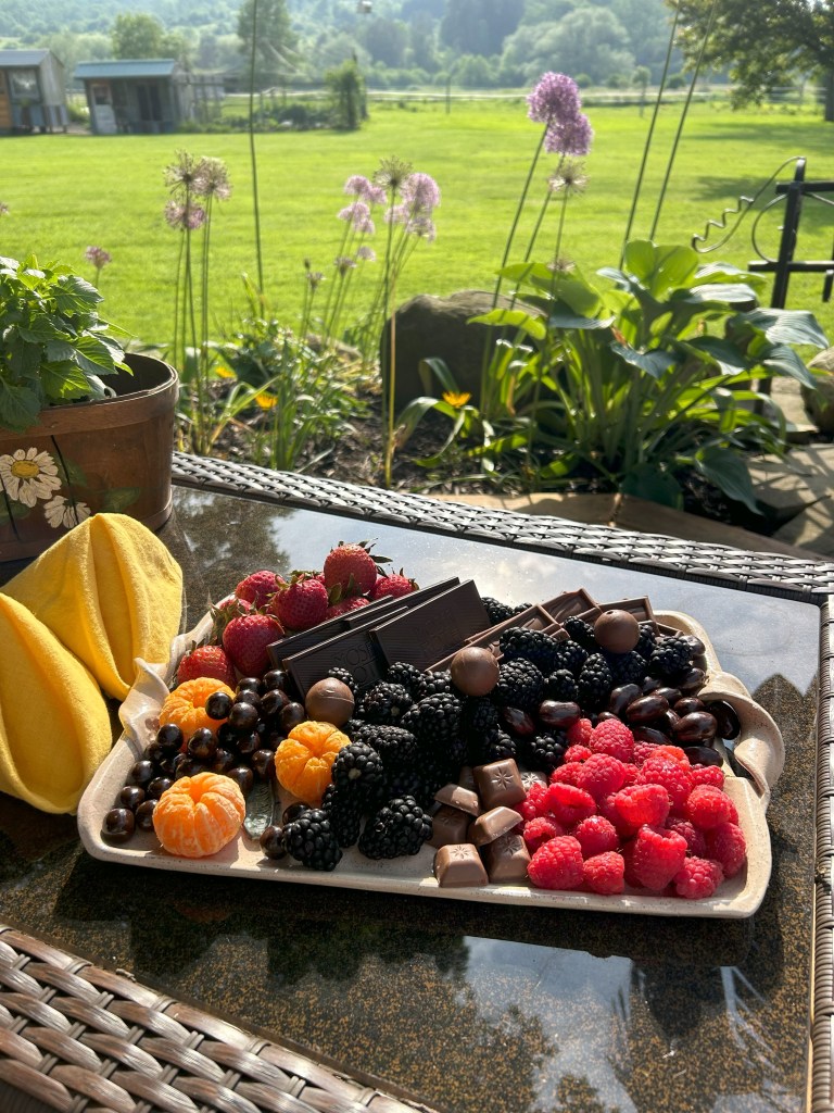 A Platter full of amazing sweetness. Fresh fruits and a variety of dark and milk chocolate… the perfect combination in front of the bonfire after a full day of local activities.